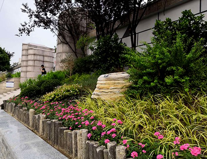 在永清門(mén)閘口處,植物特色為“竹隱青松”,以竹子、羅漢松等常綠木本多年生植物為主,營(yíng)造出綠意盎然的蔥戎景象,整體呼應(yīng)“永青”二字。