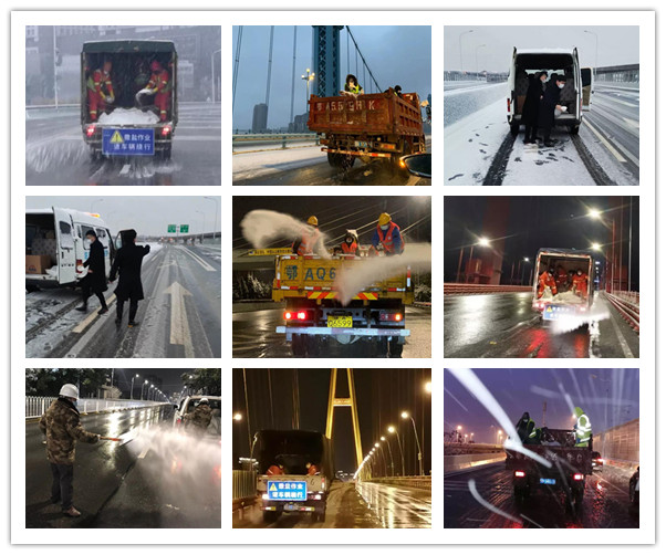 公司承擔全市13座跨江橋梁以及三環(huán)線東段、北段、南段共計84.7公里路段的融雪防凍任務。組織所屬城運公司、天興洲道橋公司、橋建集團、鐵投公司、譽城集團等單位成立應急搶險隊伍,調(diào)配312人,機械設備50臺,全方位做好融雪除冰工作。此外,公司所屬新區(qū)公司、臨空投集團還分別支援和承擔漢陽國博中心洲際酒店上下匝道、臨空新城和巨龍大道立交及附近區(qū)域內(nèi)路段的融雪防凍任務,保障防疫應急工作車輛正常通行。