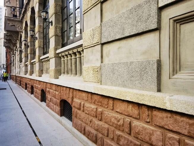 除了紅磚清水墻,水刷石線條也是巴公房子外墻畫龍點睛之筆。盡管這種裝飾線條在近現(xiàn)代古建筑上較為常見,但看似簡單的修飾線條修復(fù)起來并不簡單。天時公司施工人員在清理原有線條基層后,再對其表面進行鑿毛處理,為確保水泥砂漿附著牢固,在涂抹水泥砂漿前,還需刷上界面劑,以達到更好的吸附效果。隨后再依次進行彈線、粘條、二次涂抹水泥沙漿和麻石漿等工序,最后將面層拍平壓實,在刷子涂刷過后,面層不落石子的情況下再進行噴刷,待水分干透后再取出分格條,用水泥膏填補縫隙。在水刷石線條的施工過程中,基層的處理和麻石漿的配比尤為重要,為避免出現(xiàn)差池,施工人員精細入微,對各個環(huán)節(jié)精確把控,反復(fù)核準,有效避免了空鼓和色澤不均等問題。